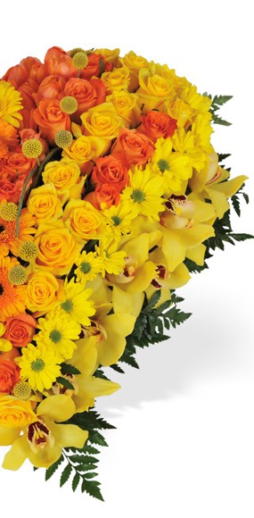 Offrir des fleurs lors de la perte d’un être cher est toujours une belle attention auprès de la famille du défunt. Cela permet d’exprimer un message de condoléances, d’apporter votre soutien et de témoigner de votre sincère amitié auprès de la famille endeuillée et de la personne décédée. C’est pourquoi Fleurs en Deuil vous propose ce coeur en fleurs dans les tons chauds : orange et jaune, avec une grande variété de fleurs. Ce coeur de deuil est composé de roses oranges et de roses jaunes et de quelques santinis verts à droite du coeur. Sur le côté gauche, on retrouve des gerberas dans un camaïeu d’orange, une belle brassée de tulipes oranges et d’un tour de feuillages tourné pour parfaire la composition florale de deuil. Le feuillage sera constitué d’aspidistra, de coco ou de cordyline, selon la disponibilité en magasin. De plus, vous pouvez retrouver dans toute la création florale des refours jaunes ainsi que des fleurons de cymbidium jaune. Il est certain que ce coeur de roses bicolores saura rendre un bel hommage à la mémoire du défunt. Votre compositions de fleurs funéraires sera réalisée par un de nos artisans fleuristes diplômés, avec de belles fleurs coupées qui sont des fleurs naturelles (jamais de fleurs artificielles). Il mettra uniquement des fleurs de saison, c’est pourquoi les fleurs sont variables selon les saisons et la disponibilité en magasin, mais l’esprit, la forme et les couleurs de la confection florale initiale seront respectés.
