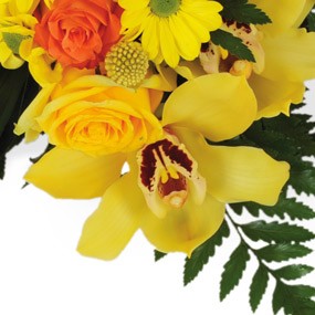 Détails du Coeur en fleurs tons orangés "Murmure" : refour jaune, rose jaune, rose orange, santini vert, gerbera jaune, gerbera orange, tulipe orange (selon saison), fleuron de cymbidium jaune et feuillage. (Fleurs variables selon les saisons et la disponibilité en magasin tout en gardant l'esprit, la forme et les couleurs.) (Réf. Florale 9208, Murmure.) Visuel non contractuel, visuel correspondant à la formule Meilleur Compromis
