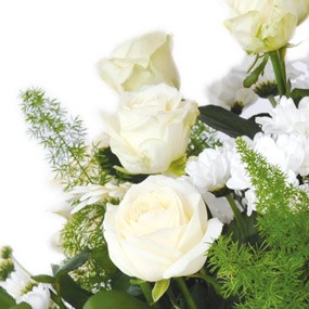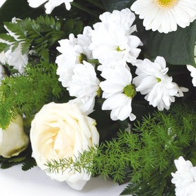 Détail du Coussin de fleurs blanches "Pureté" : roses blanches, gerberas blancs, refours blanc, de branches d'asparagus et de fougères (Fleurs variables selon les saisons et la disponibilité en magasin tout en gardant l'esprit la forme et les couleurs)(Réf. florale 9219, Pureté) - Visuel non contractuel - Visuel correspondant à la formule Meilleur Compromis