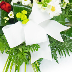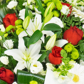 Détail de la Gerbe de deuil de fleurs rouges & blanches : muflier, santini, gerbera, lys, roses rouges , lisianthus, de fougère et d'aspidistra. A la base de l'ensemble, un noeud formé d'un large ruban blanc (selon disponibilité)(fleurs variables selon les disponibilités en magasin tout en respectant les formes et les couleurs)(Réf : 0959 - Gerbe de fleurs rouges et blanches) - Visuel non contractuel - Visuel correspondant à la formule Meilleur Qualité/Prix (Dimensions : 90cm de long / 60cm de large) - Non compatible pour les crémations.
